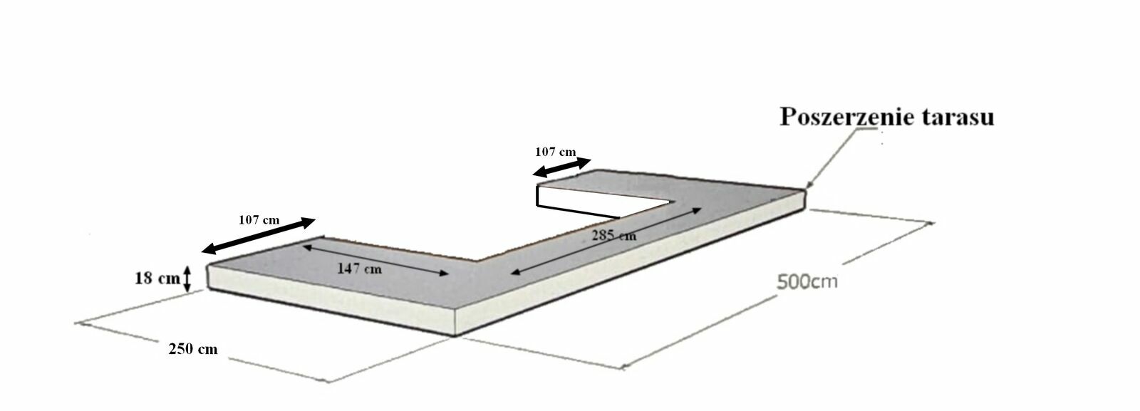 • Powiększenie tarasu z obecnych wymiarów 147 × 285 cm (wysokość 18 cm) do ok. 250 × 500 cm.